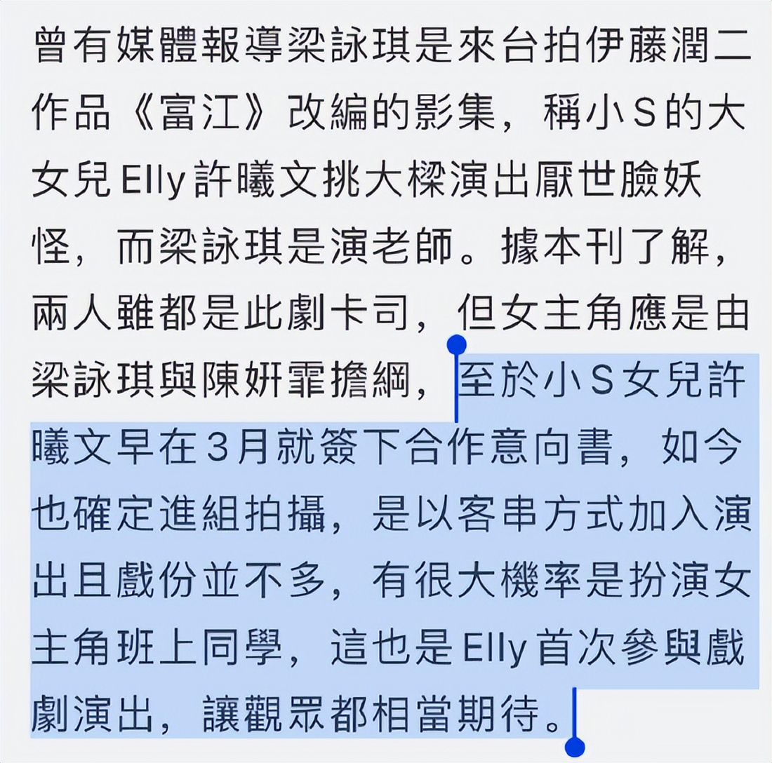 前不久,就有传闻说小S大女儿将出道演戏,小S表示会支持女儿的想法。最近,据台媒消息,小S大女儿许曦文确定以演员出道,将参演梁咏琪、台湾新人陈妍霏主演的伊藤润二《富江》改编的影集《聪明镇》。