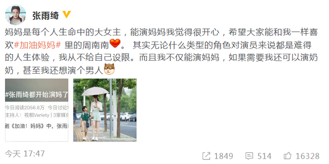 张雨绮出道早,成名走红多年了,所以也到了三十多岁的中年阶段,虽然在努力装嫩,但确实中年妈妈的风采毕现,再强撑演少女或者单身女星,有点违和。不过大大咧咧的张雨绮,对于角色的风格和年龄及角色,应该是不设限的。