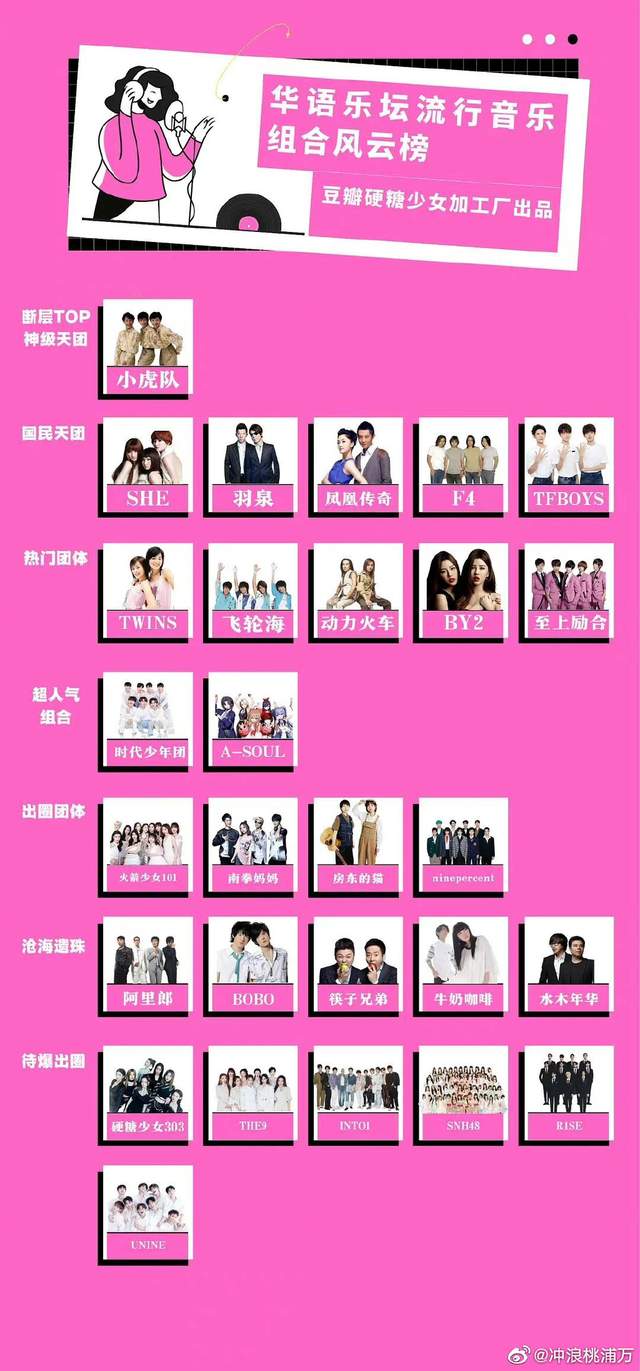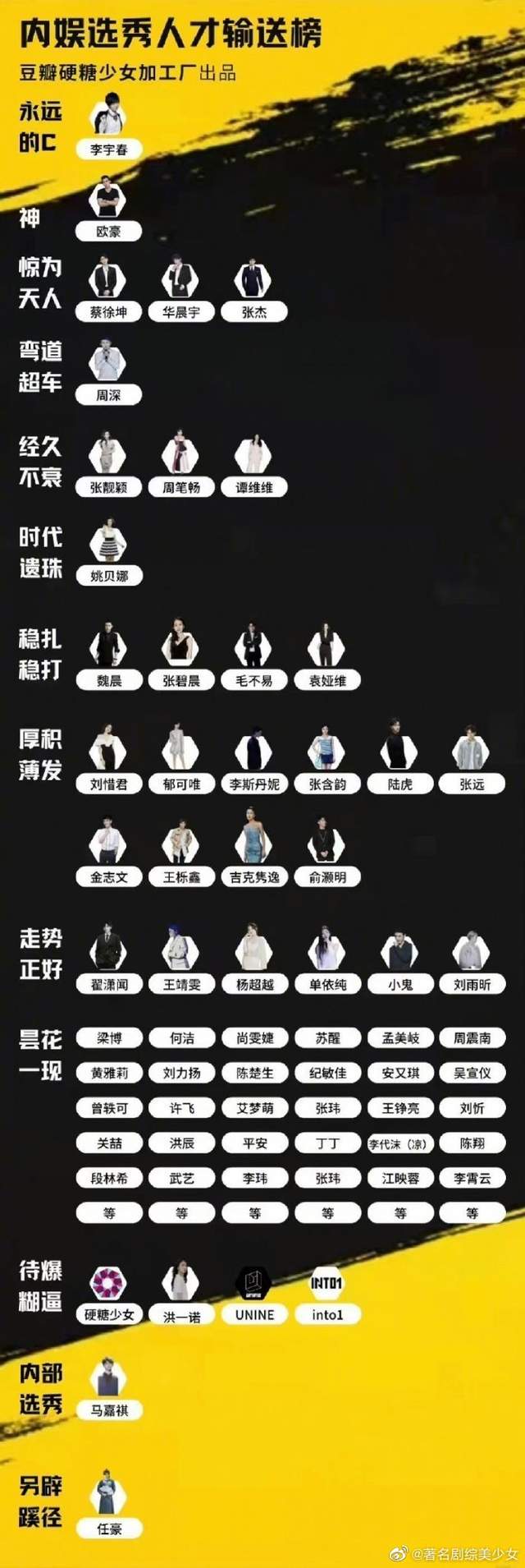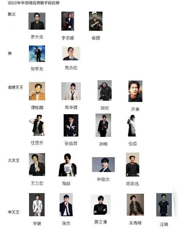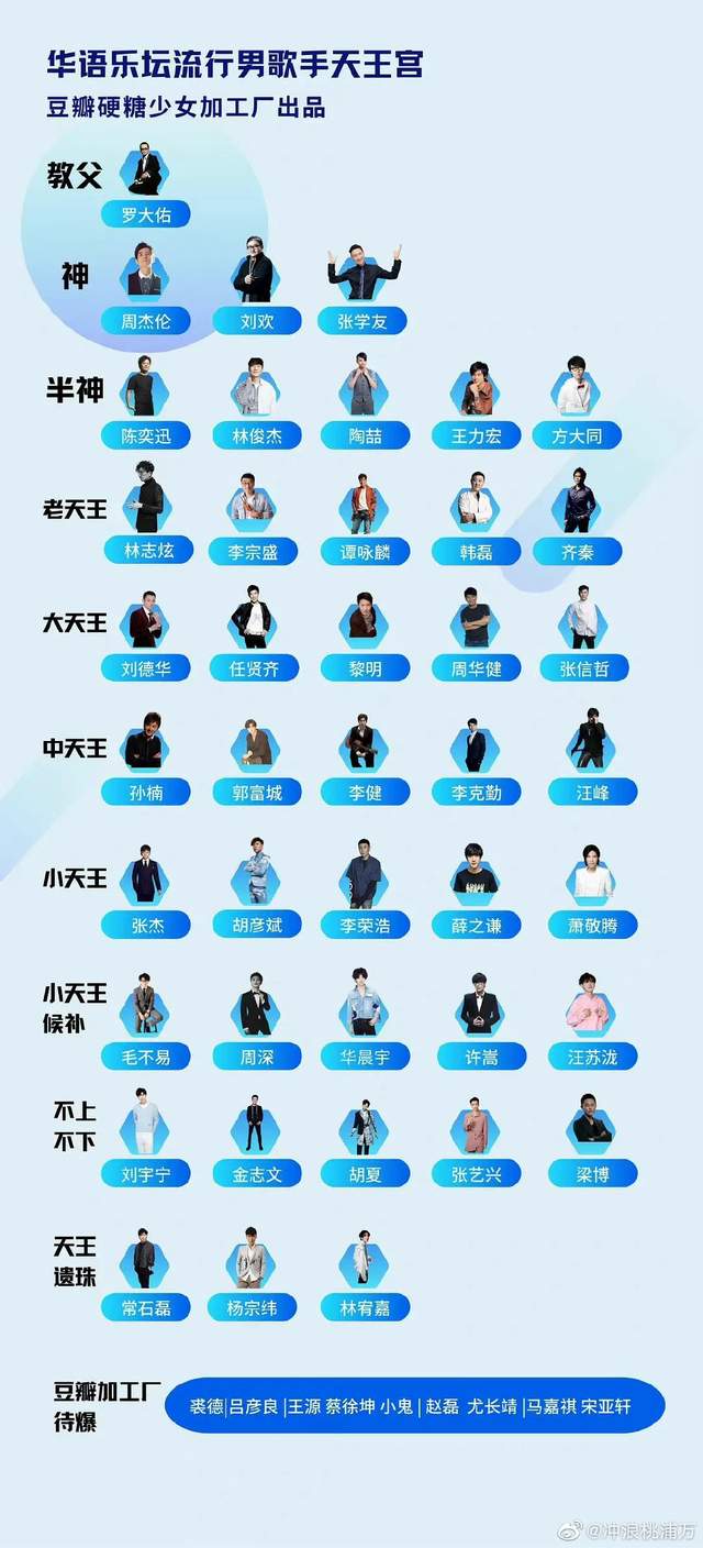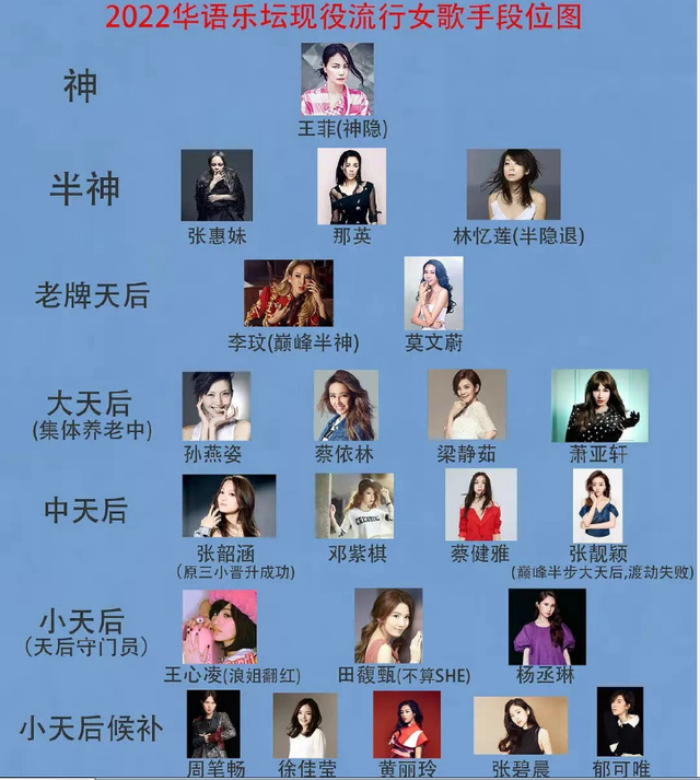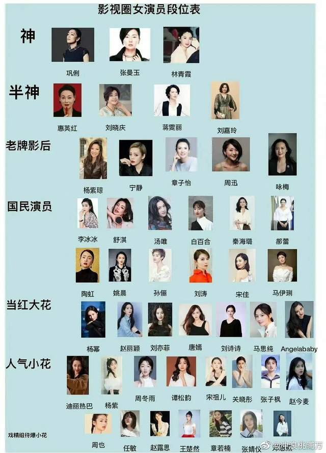 本来刚开始以为只是乐坛女歌手段位表,后面出来男歌手,还有组合、唱跳等等。再然后,又出来影视墙男女演员段位表,还没结束,接着又出来内娱选秀,涵盖很齐全了,不知道后面还会有什么榜单段位表吸引眼球。虽然都不是任何官方或者机构发起,只是网友娱乐,却搞得很齐全。