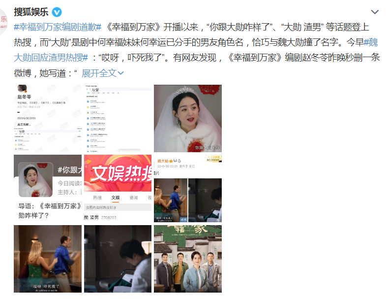不过很快《幸福到万家》的编剧也道歉了,剧本是六年前就创作了,那时候魏大勋还没啥名气,肯定不会是讽刺魏大勋。所以某种意义上,魏大勋这次躺枪,反而让他享受了赵丽颖和这部剧的热度,多了关注度和话题,于是才有人注意到魏大勋最近也有新剧在播,所以躺枪之后,更多是沾光。
