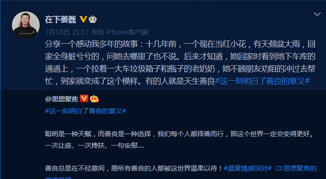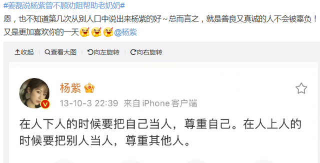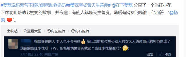 另一方面,这次热搜话题词是#姜磊说杨紫曾不顾劝阻帮助老奶奶# #姜磊夸杨紫天生善良#,虽然姜磊夸杨紫善良是事实,但是却加了个不顾劝阻,有点不合适。首先,帮助老奶奶这不是什么冒险的坏事,为什么朋友或者同行的助理司机等人,会劝阻呢,显得他们多没爱心,也不去帮忙杨紫一起做善事,还劝阻,太没同情心了。其次,当时外面倾盆大雨,拾荒的老奶奶,为什么这时候要带着废品出去呢,不怕淋湿了不好卖吗,然后杨紫的助理们居然也不给她撑撑伞,具体细节,也让人有点不解。