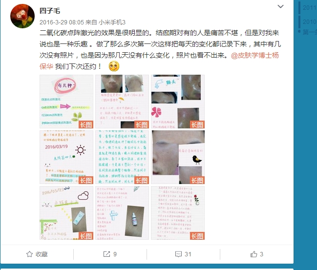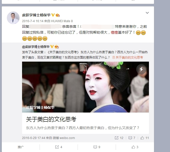 涨粉固然是不错的,但通过微博真正帮到需要帮助的患者才是令人最开心的。我写的科普文章大多都是干货,无论是关于婴儿湿疹的,还是关于痘痘的科普,相信有很多人受益。有些患者因为我的回复,痘痘好了,向我致谢,也让我兴奋不已。还有患者主动承担起我的宣传工作,把自己治疗前后的照片传到网上,竟然帮我揽粉无数。微博的影响力是全国性的,来找我就诊的还有很多外省过来的,如北京、上海、甘肃、湖北、云南等,尽管这能满足我的虚荣心,但我是非常反对这种方式的,因为这有悖于卫生经济学。