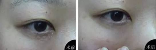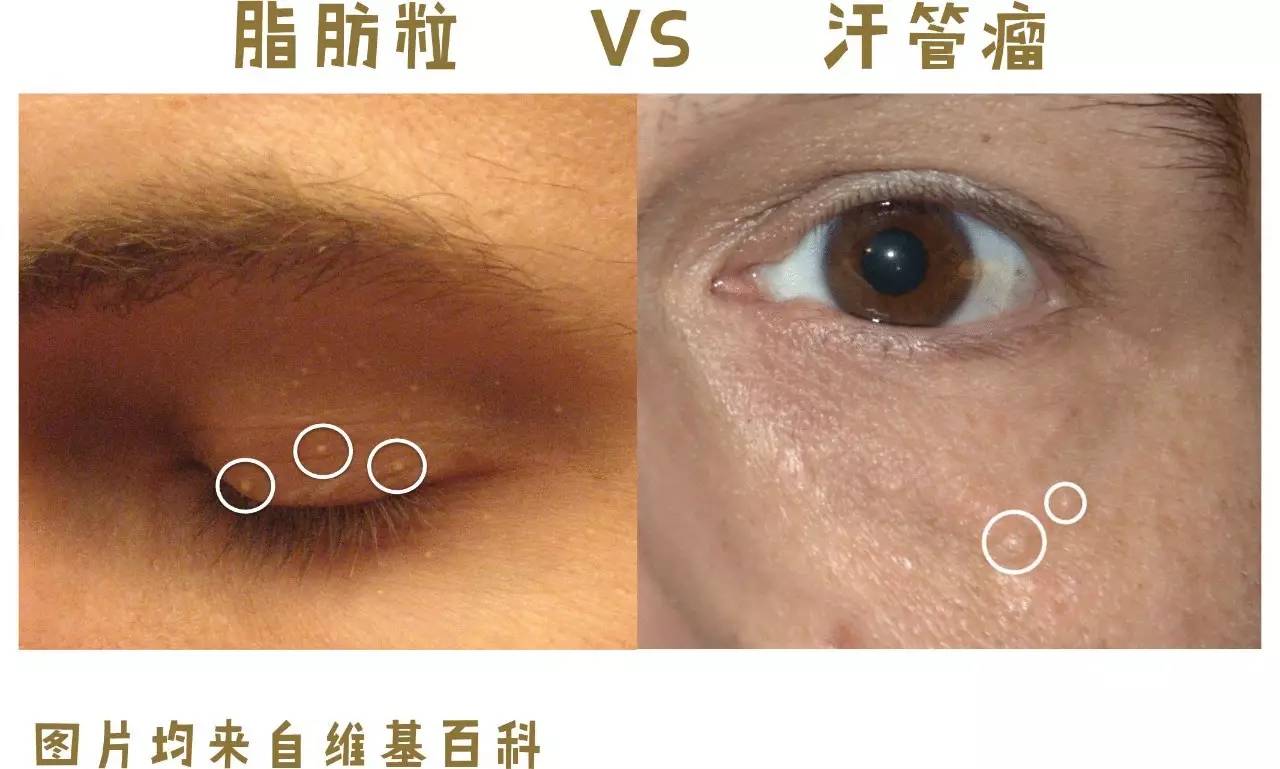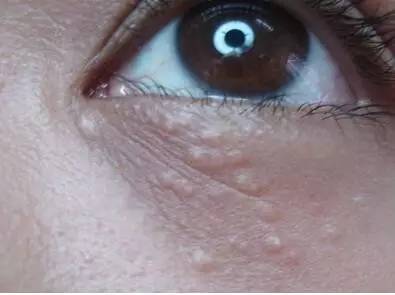 很多人眼睛周围有一粒粒的小丘疹,像这样。