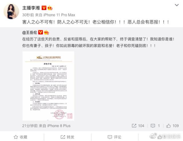 果不其然,王岳伦发文怒斥造谣者,并表示为了自己的名誉和家人,要与对方“死磕到底”。随后主播李湘转发力挺老公,“害人之心不可有!防人之心不可无!老公相信你!恶人总会有恶报!”这一场闹剧也因一纸律师函,而烟消云散。