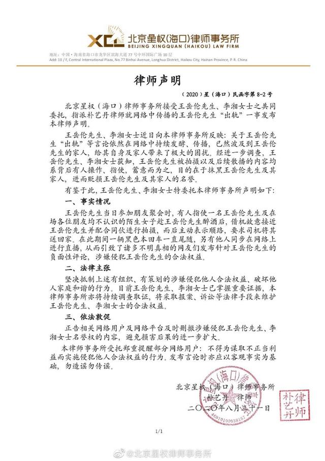 目前,王岳伦夫妇已经委托北京星权(海口)律师事务所就网上不实内容发出律师函,正告那些造谣者和跟风炒作者以正视听,这不仅是对自己名誉的捍卫,也对那些无视法律的人得到震慑作用。