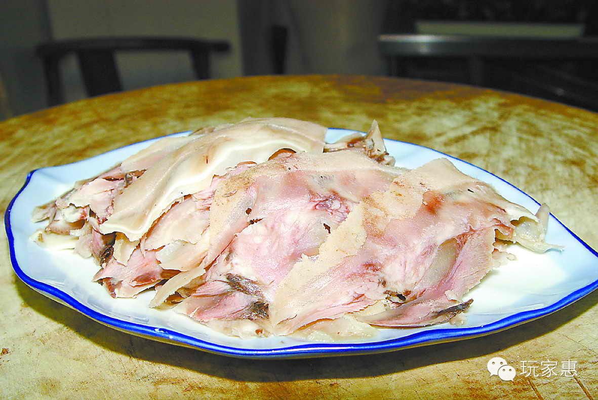 李记白水羊头已经有上百年的传承了,早年间,卖白水羊头都是走街串巷,手持牛耳刀,刷刷片羊头,肉片薄如纸,能隔着看字。现在这个手艺还能见到,在进店的地方,有专门的伙计片羊头肉。