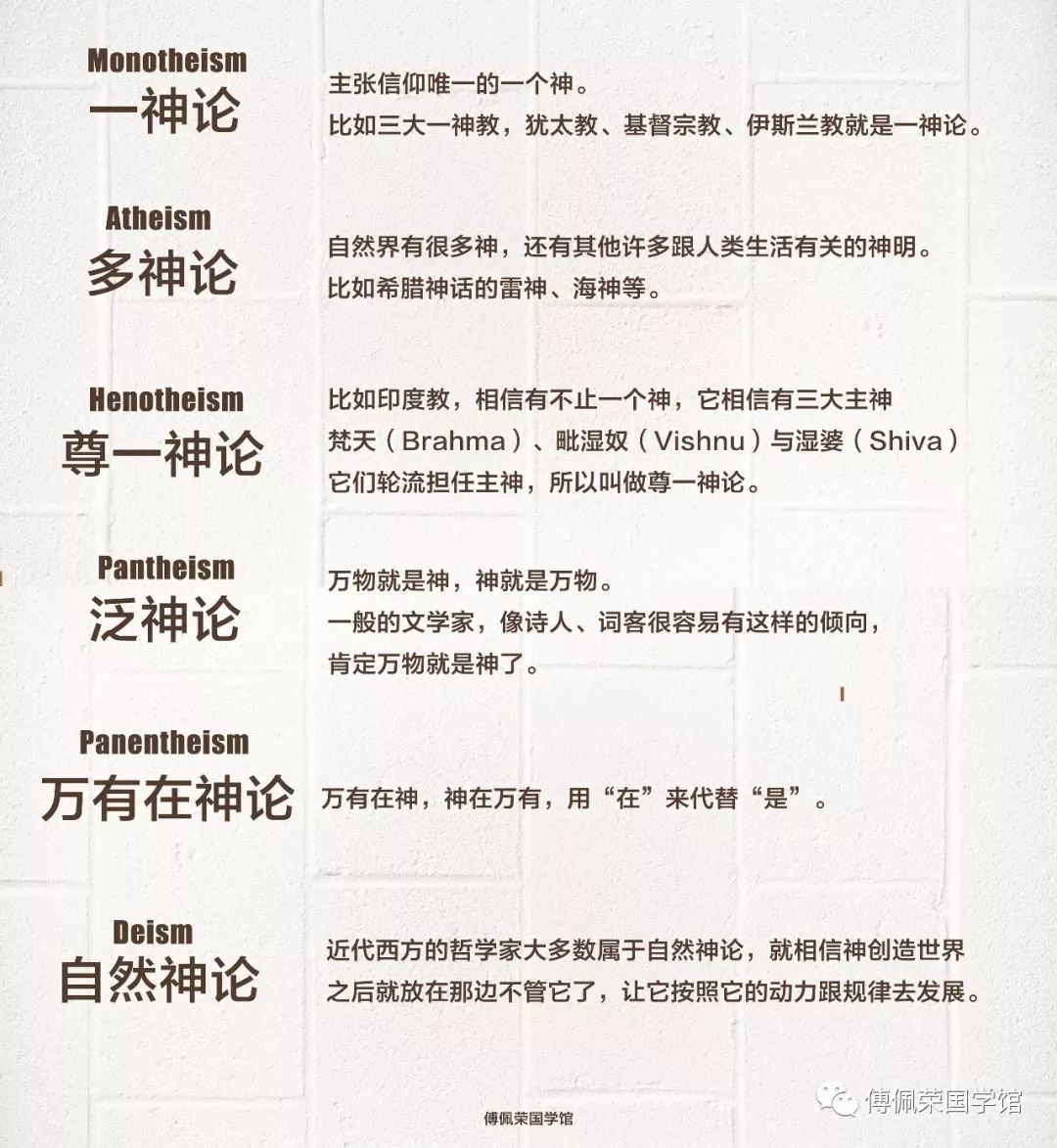 在“无神论”和“非神论”两者之外,大致其他的与神有关的词都属于“有神论”的系统。至少有六个词我们常看到的: