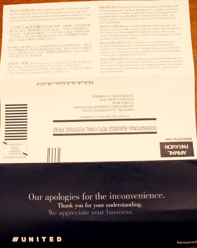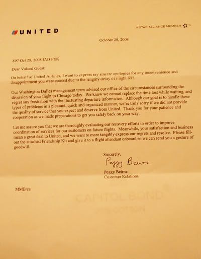 五、在重新登机的时候,每个乘客都收到了书面的致歉信,附有相关要职人员的签名。更妙的是,还收到一张表格,添好后交给空中小姐,就将收到美联航赠送的旅行奖励。