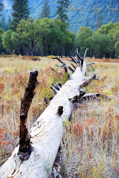 还好,优山美地特有的大石头,永远展露着不变的姿容。世界上最大的一块裸露在地面上的花岗岩就坐落在这里。它名叫El Capitan,有半英里高,一英里宽,全是实打实的石头。为了拍这个大家伙,我不停地后退后退后退,最后还躺在深秋柔软的黄草中,终于拍到了它完整的身段。