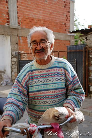 旅馆的老板带着面包回去准备早餐,而我则在小镇塞尔丘克的晨光四处游荡,一位头发花白的老人穿着花毛衣推着车子走了过来,他和善的笑容怂恿我拍了几张,老人微笑着示意我在这里等一会,然后就骑着车子弯回去了。几分钟后,自行车上多了一束漂亮的白花儿,老人微笑地将他送给我,比划着好象是说这是他们家院子里自己种的。OH MY GOD,虽然不是一位PLMM送的,但是这样的际遇,着实浪漫得一塌糊涂。
