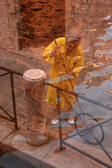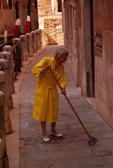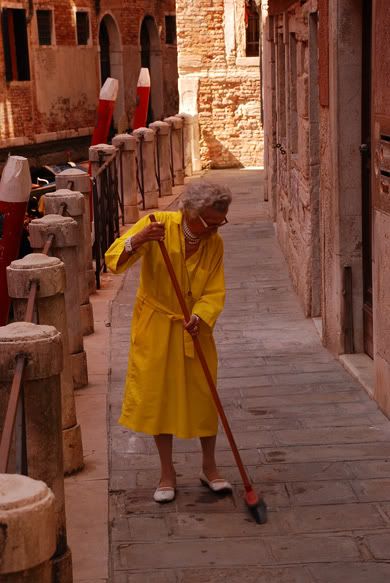 我在这座桥旁边闲站着,桥下是一只只刚朵拉轻轻划过,前面那坐桥上,不时有帅哥美女老人孩子上去被拍照,就在这时,一个明黄色的身影划入我的眼帘,她太有范儿了,太优雅了,就那么不慌不忙的,悠悠闲闲地打扫着小街,与自家门窗,可是那样的身影,一下子就盖过了桥上路边的N多美女。