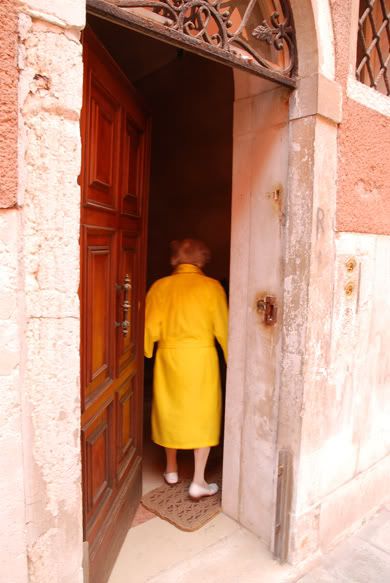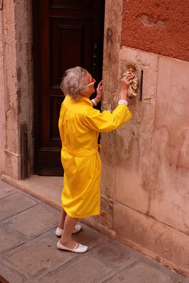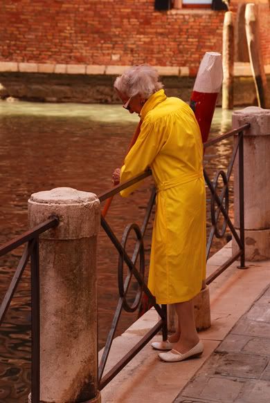 可是,突然间,她,出现了,刹时谋杀了所有的眼球。一个优雅的老太太,那一身明黄色的衣服,不知道是哪个大牌的风衣(威尼斯虽小,寸土寸金,但是几乎所有大牌均在此处在店),还是她的工作服,总而言之,配上她的银发,银色的眼镜,白色的鞋子与饰物,那范儿,真是大了去了!