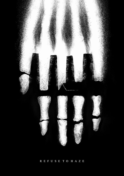 黑一烊:海报可以是设计,可以是艺术,可以是装置,可以是互动,也可以是工艺练习的载体。作品运用雾霾的特质进行设计创作形成一张人脸像,极具视觉冲击力和艺术的张力。这幅作品发挥了海报的特质,是我本人较喜欢的作品之一。希望设计者能将其延展成为一套系列作品,不仅仅是海报,也可以作为装置等其他现代艺术形式存在。这是一个非常不错的题材和表现形式。