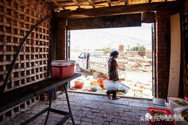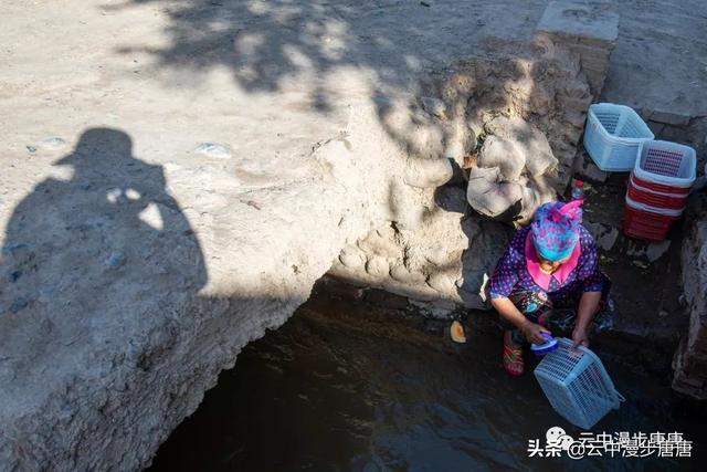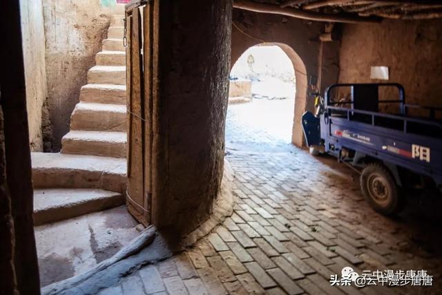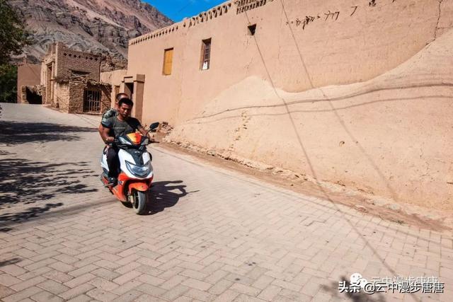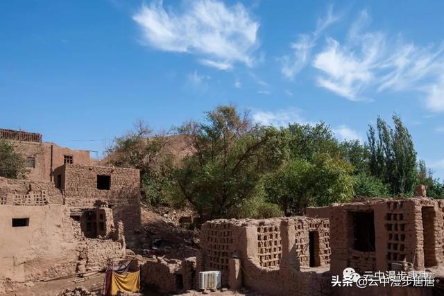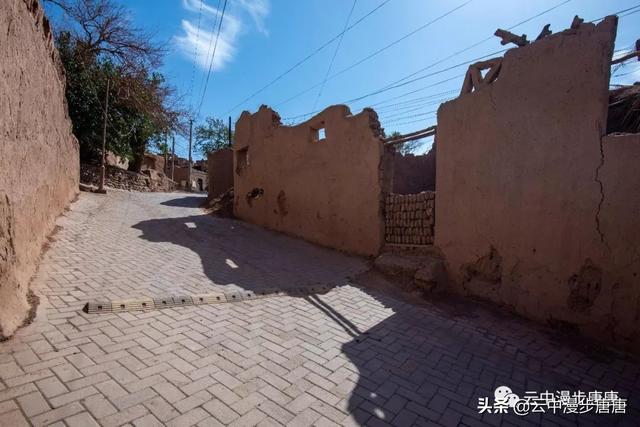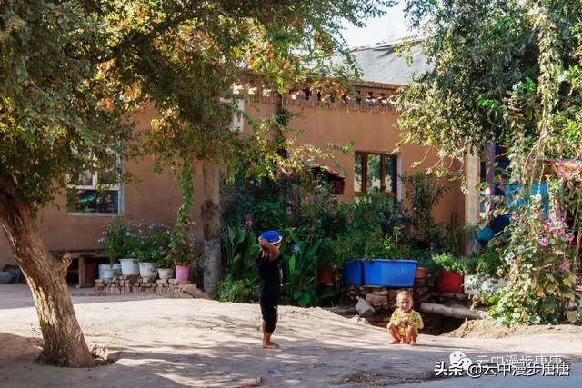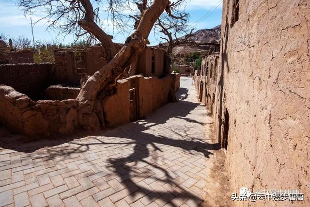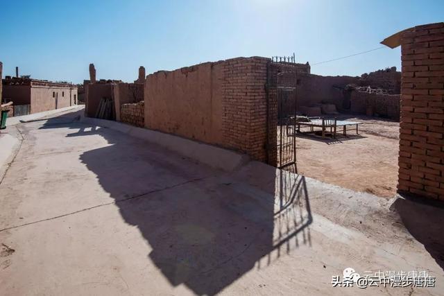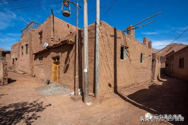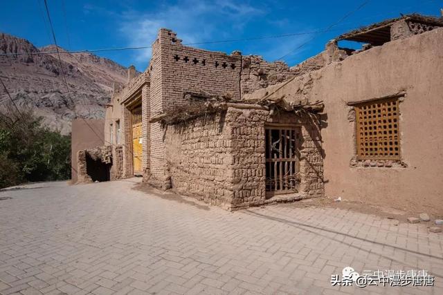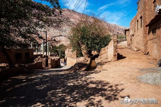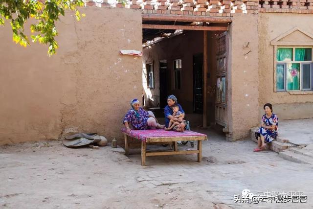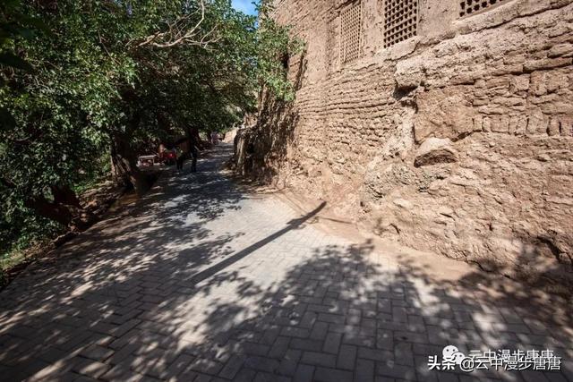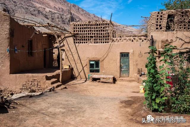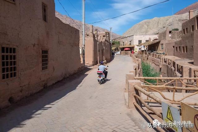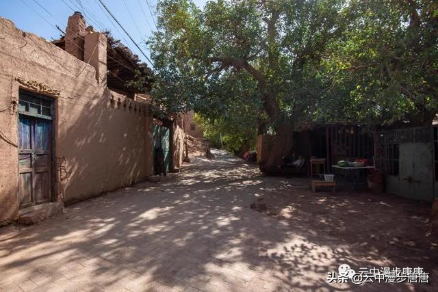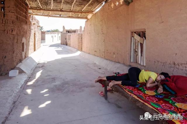 站在艾克曼古丽家房顶四处望去,一条溪流贯穿整个村子,村子里人家房顶错落有致户户相连,这些民居全是土木结构的黄黏生土建筑,门窗古朴。正午的阳光晒得晾葡萄的姑娘困意渐生,趴在巷弄里的榻榻米上睡着了,太阳照不到的阴影处很是荫凉,尽管正是伏夏之季。