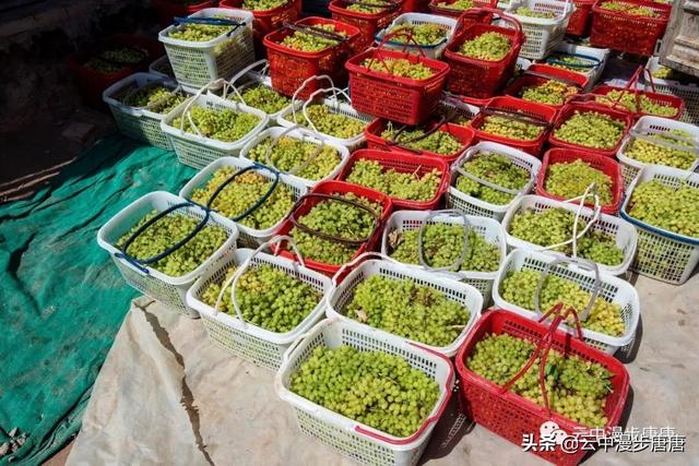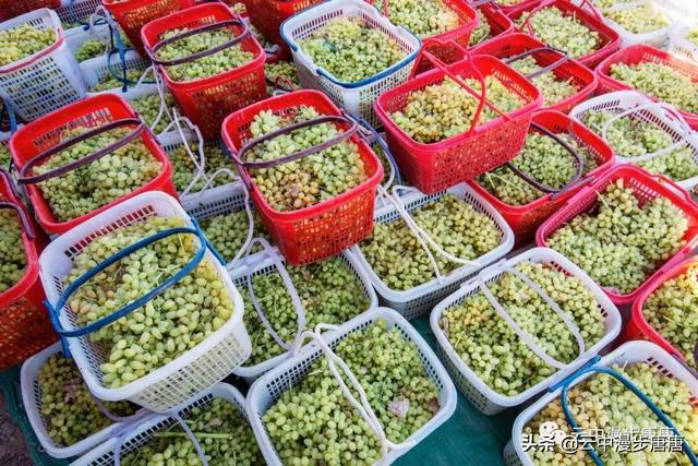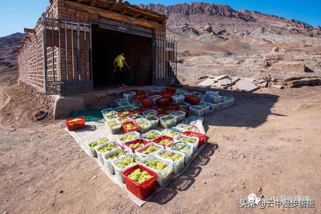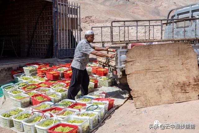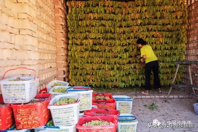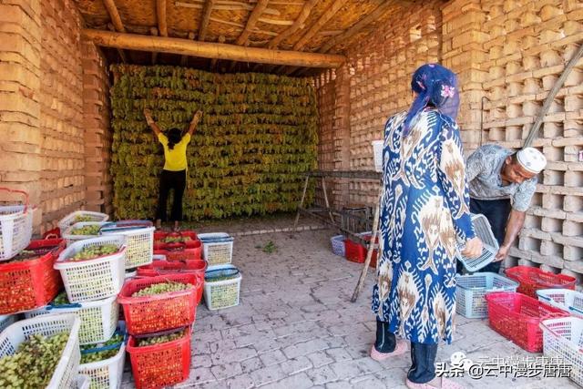 吐鲁番到吐峪沟的途中,公路两边随处可见成排延展的葡萄架碧翠一片,架下结得密密匝匝的葡萄。路边、村旁,有许许多多为晾葡萄干而搭建的晾干房,多为生土建筑,墙壁上是为晾干房通风而开的整齐划一的方形小孔,这些晾干房或成排成行或独处一隅,在整个吐鲁番形成一道独特的风景。