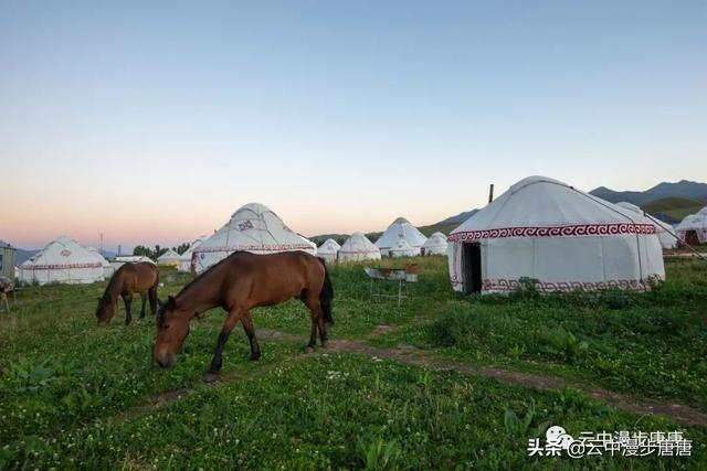 从独库公路217转入218公路当晚,哈萨克第一村开启草原之夜,蓝色天幕下一个个帐篷似小蘑菇朵朵,漫天夜空星辰熠熠,草原小伙子的吉他声一直弹进了梦乡……清晨,巩乃斯河水欢腾着,骑马的汉子吆赶着羊群沿山坡草场放牧,金色的阳光洒在山岗树尖村庄,最美的风景一路流淌!