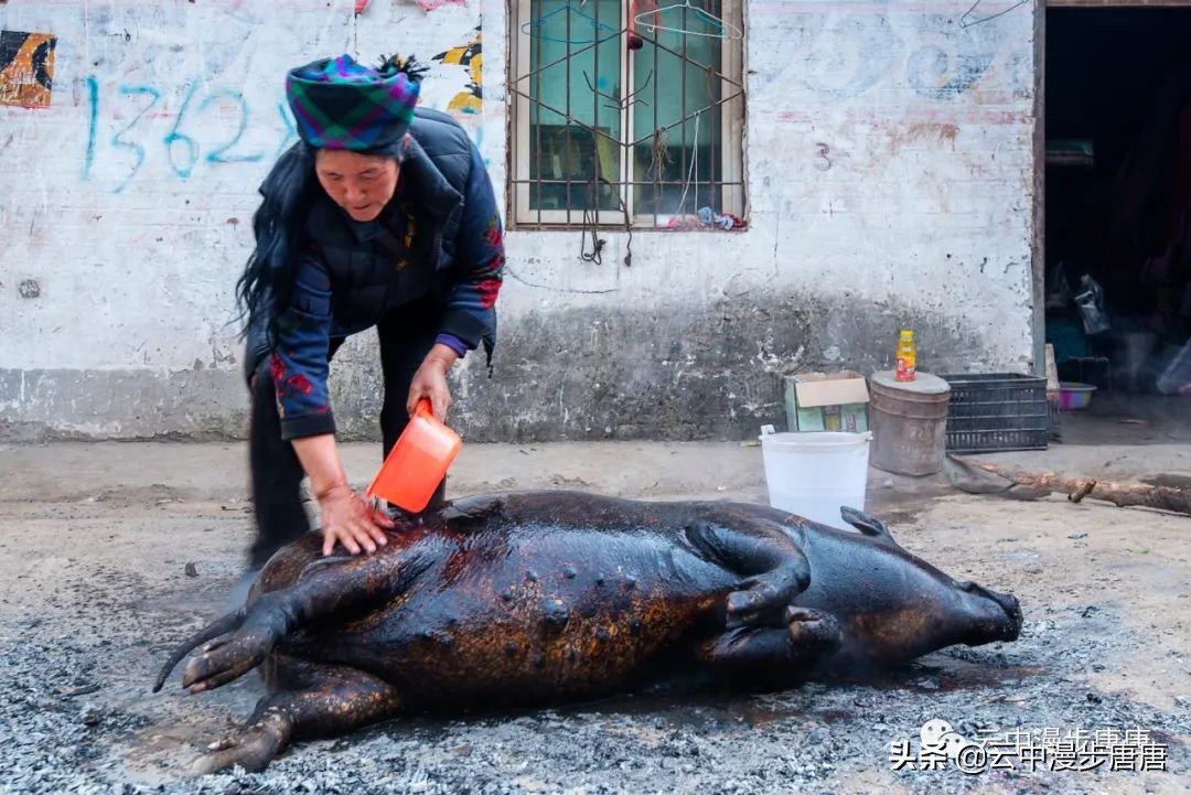 杀猪队走进院子,主人家敬上迎客烟和酒,杀猪队人人饮下一杯酒后,一群人就将黑猪拖出,主人家里舀来一瓢冒着烟气的水,从年猪头上绕一圈,据说这叫“洛擦所”,用以除去猪身上不洁净的东西,用蕨芨草烧过猪毛也是以示猪是洁净的了。之后,一众壮劳力摁住猪,杀猪队的头领拿一木棒,迎头一棒重击,猪就倒下了。亲眼目睹如此原始的杀猪方式,感觉像自己遭当头一闷棒,好生难受。随后杀猪人一刀进去,猪血汩汩流进盆里。杀好一家,杀猪队一帮人在拿木棒的领头人引领下,吆喝着去往下一家,如此轮番一家家,直到全村家家户户的年猪都杀完。