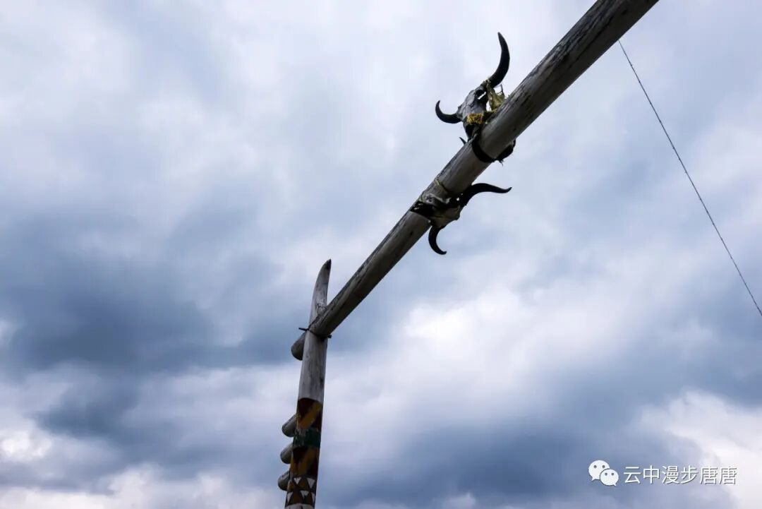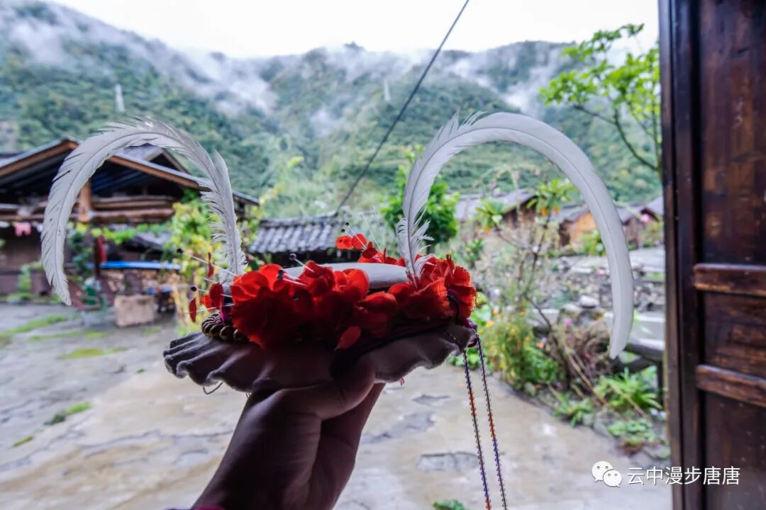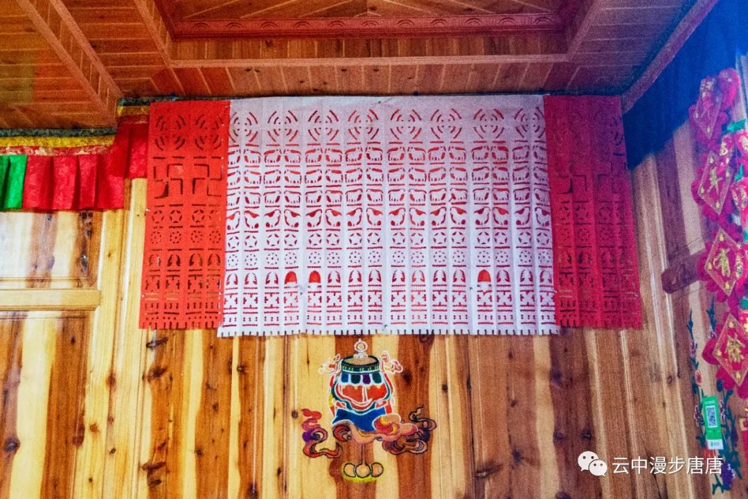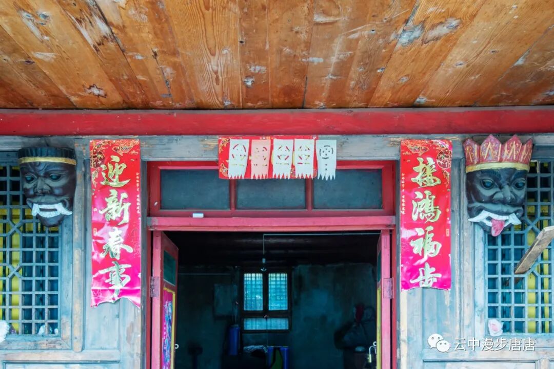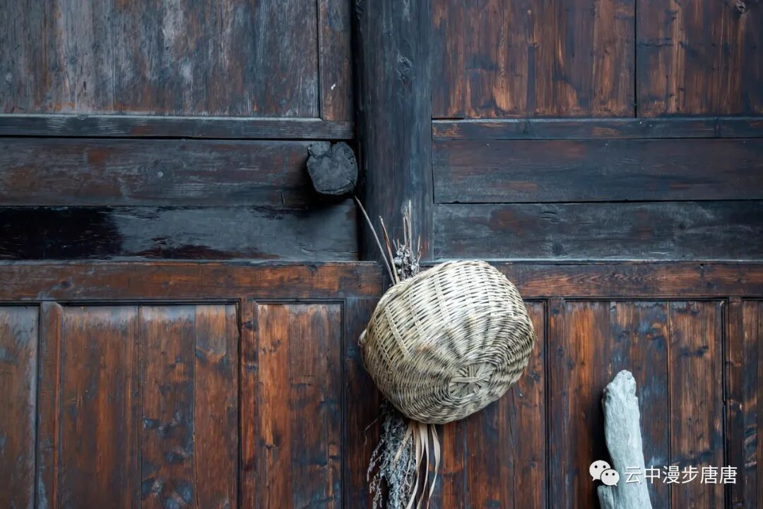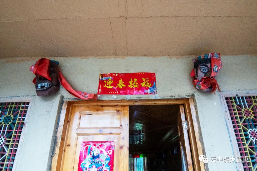 白马人的房屋建筑除了屋脊上的白公鸡,门头上挂着的曹盖也是极具神秘的民族符号,像极川东北门头上挂的吞口,镇宅驱邪。这曹盖其实就是面具,每逢正月初六,白马人的年俗里都会跳“曹盖”,白马人会戴上曹盖,大张手臂跳起夸张的舞蹈,这是一种古老的祭祀舞蹈,跳前要祭祀山神,抛洒祭品,以祈福风调雨顺、五谷丰登、人畜平安。遗憾的是来的不是时候,无法亲历那种神秘、热闹与欢腾。
