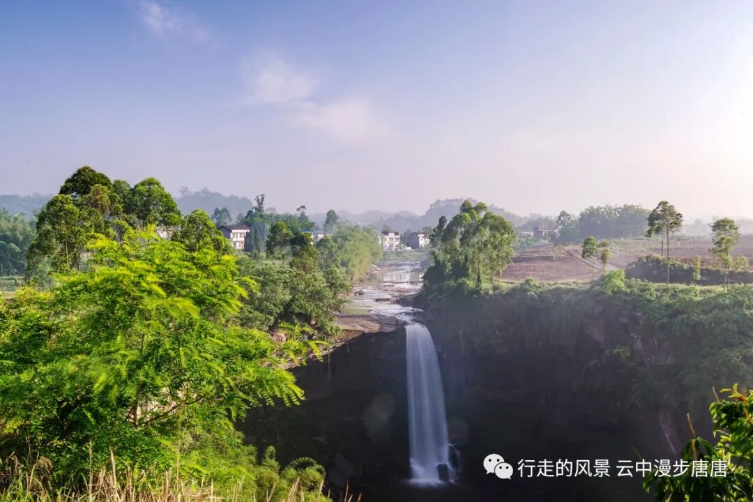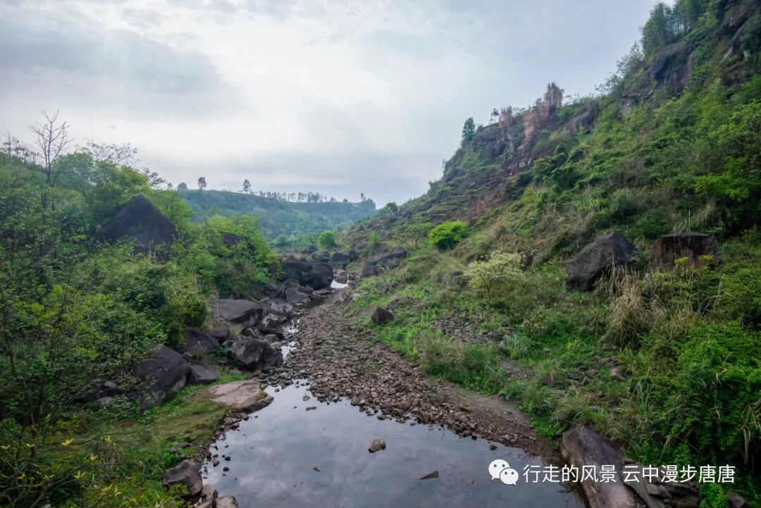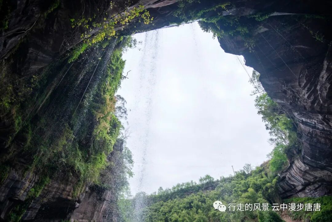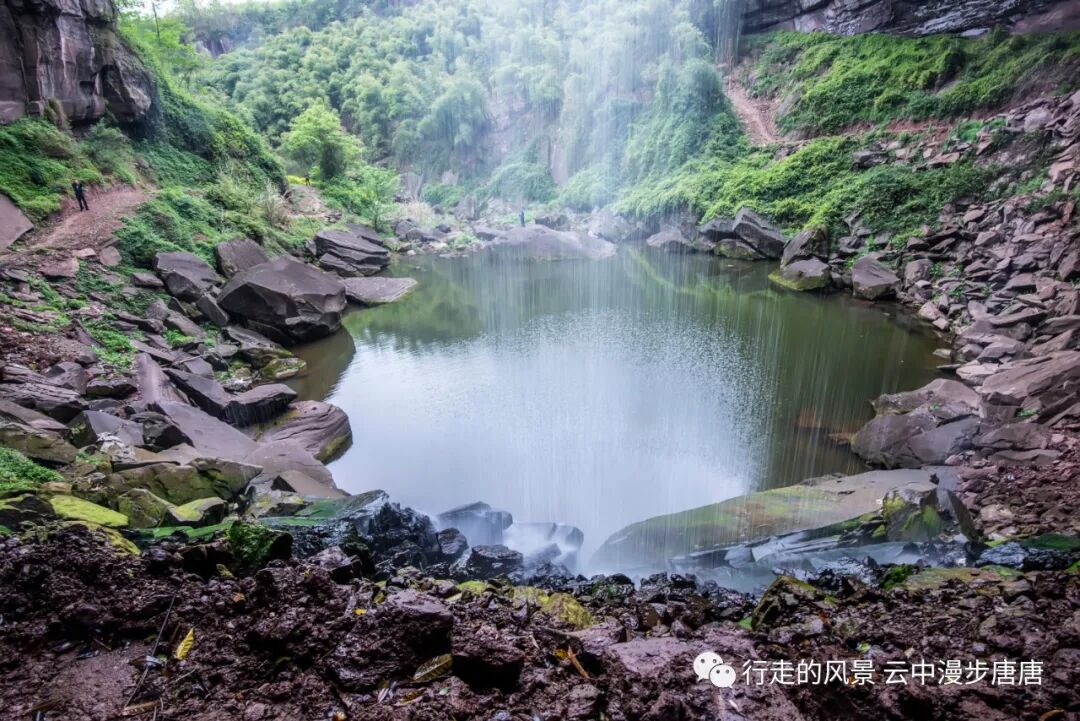 箩篼岩的水源自岳池县粽粑乡,系长滩寺河右系支流,经白庙、新场,一路流淌,至老牛湾与踏水河汇聚一起,流过大桥,经一段平缓的河滩来到箩篼岩崖口。箩篼岩是一个巨型岩石凹陷,崖高六七十米,水流从崖口飞坠峡谷谷底,谷底当地称洞塘。洞塘三面环壁,仅留下一口子沿谷底石滩通往峡谷以外。箩篼岩近两年在岩上建了观景台,从观景台远远看去,瀑流一线直坠谷底。我还是喜欢沿电站石梯走下峡谷,像十年前第一次去时那样,一步步慢慢走下谷底。峡谷里嶙峋的怪石,清澈流淌的河水,水面上轻捷划过的水鸟,碧草青青地、牛儿悠然吃草。走累了躺在大石头上听着竹与树的风声,还有峡谷四周不时传来的鸟鸣,白鹭舞姿蹁跹……箩篼岩新开了一条土路可直通谷底深处,抵达瀑布之下,抬头仰望,瀑流直下,因是枯水之季,瀑流清涓秀雅,如丝如雾,飞坠入溪谷环抱之中,绿树映衬下碧翠一潭,穿过峡谷石滩一路涓涓流淌,汇入三溪河。