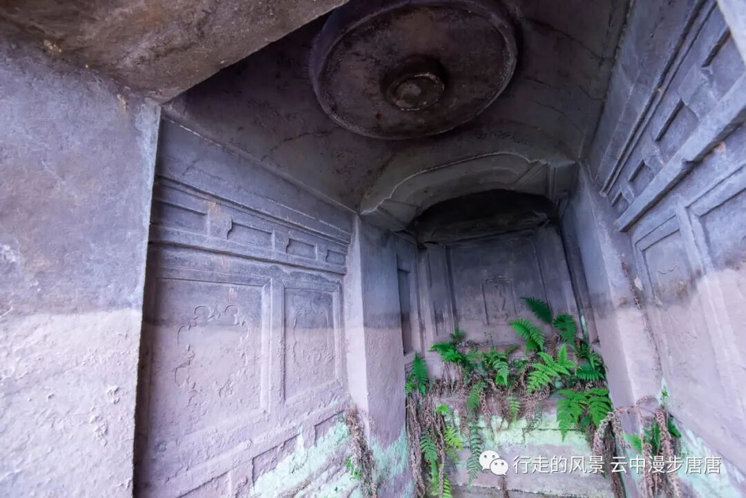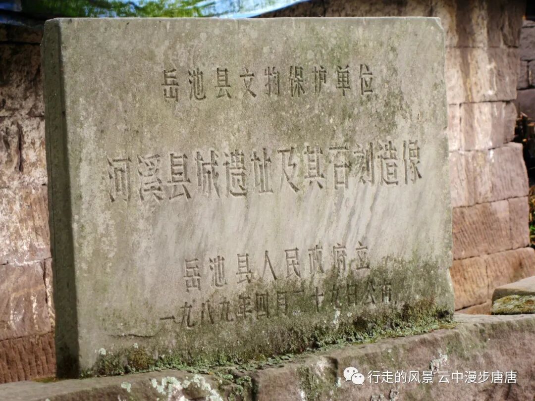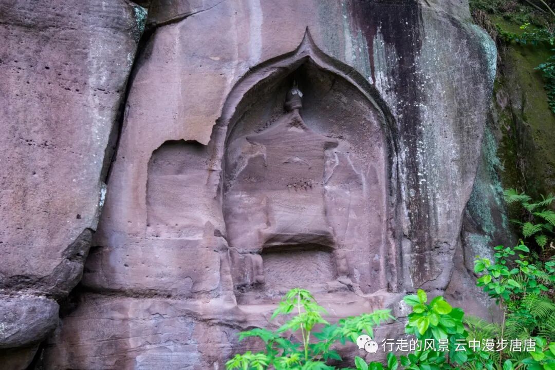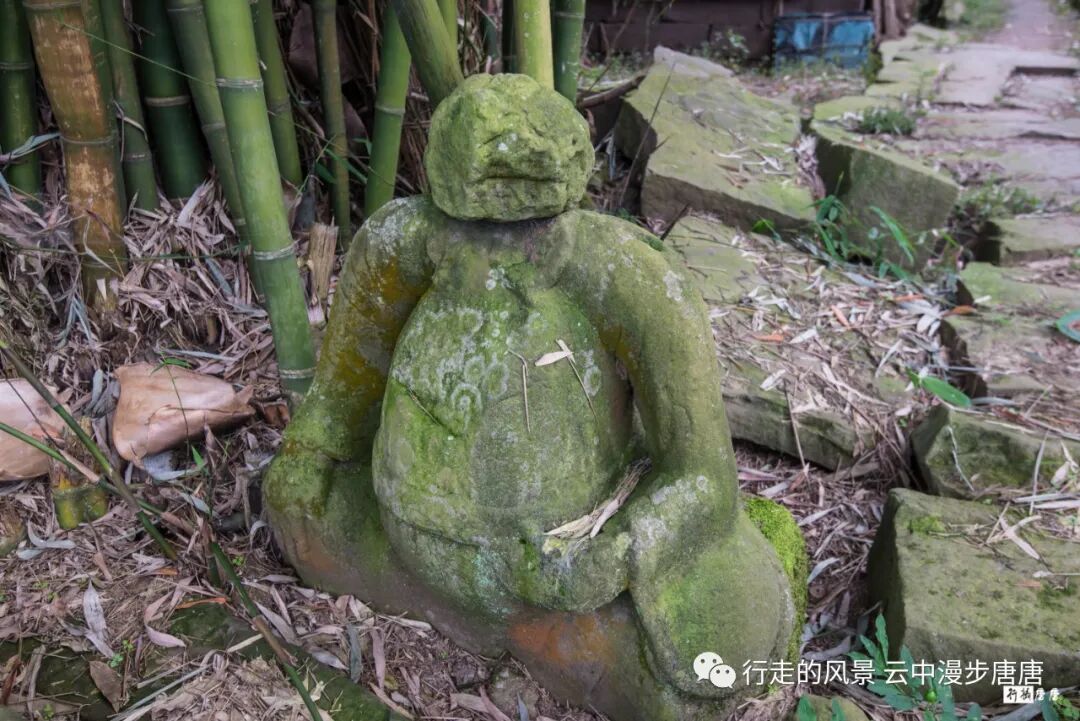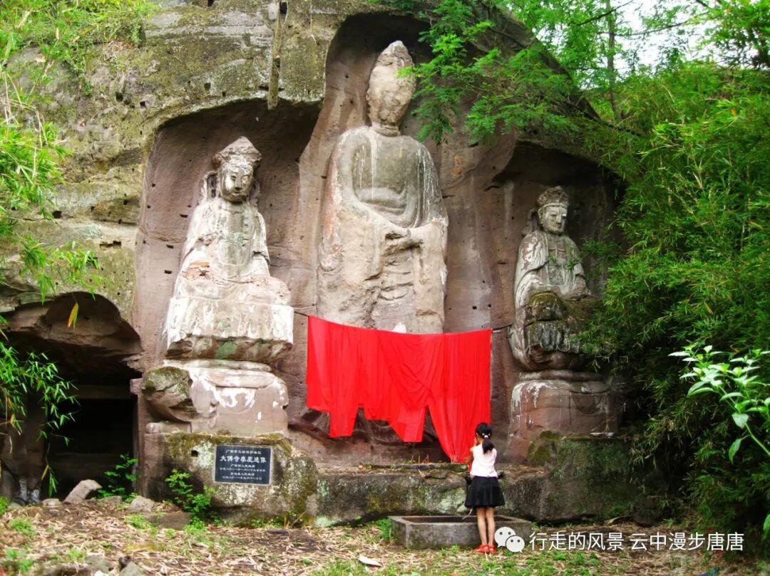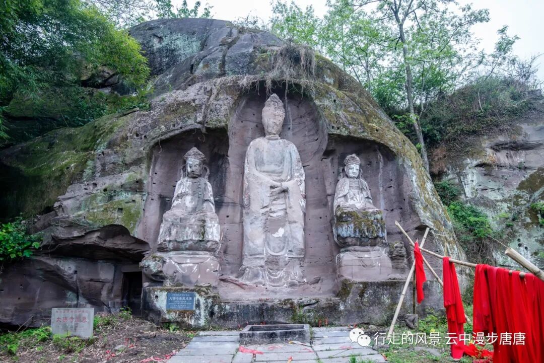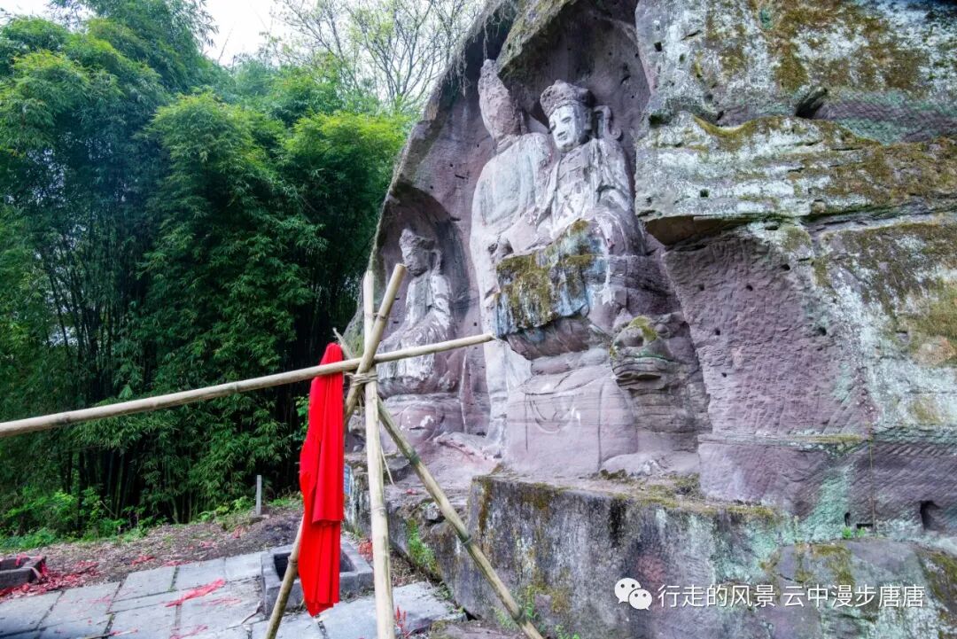 “五里三座庙,桥上又重桥,黄角树夹碑料”是流传在和溪村的民间谚语,这里提到的五里三座庙指的是水福寺、回龙寺、大佛寺。回龙寺已无踪影,大佛寺寺庙解放初期曾做过小学,于文革时毁。与寺庙同毁的还有大佛寺成百上千的小菩萨,那面坐西向东近百平米的崖壁上仅剩下华严三圣三尊石刻立于佛龛内。佛龛呈“山”字形高7米宽6米,正中释迦牟尼大日如来佛,身披袈裟垂首直立莲台,高约两丈,佛头乃毁后抹泥仅作简单修复面目全非。如来左右分别是坐于青狮之上的文殊菩萨与坐于石象之上的普贤菩萨,石象的长鼻子仅剩半截。华严三圣石刻一旁竹林掩映的石壁上还有一座瘗窟(即和尚墓),从山下到崖壁边一路四处有躺卧的石雕佛台、残缺的盘龙柱础,大佛寺前一长溜系念着百姓的祈福红布悬挂于竹竿,三尊宋代摩崖佛像倚山而立,垂眉苍生寂寂无语。