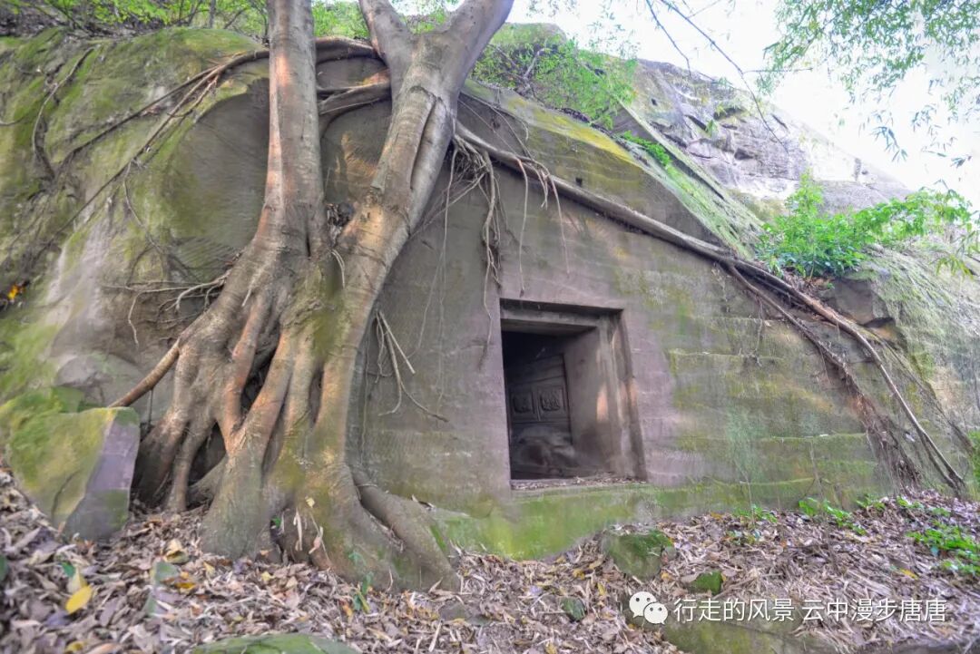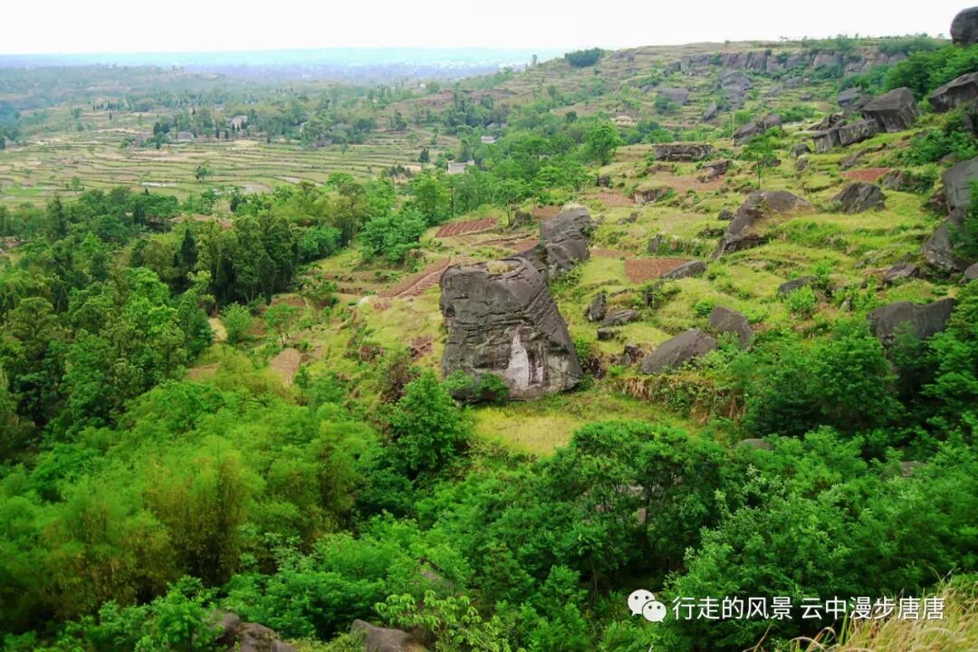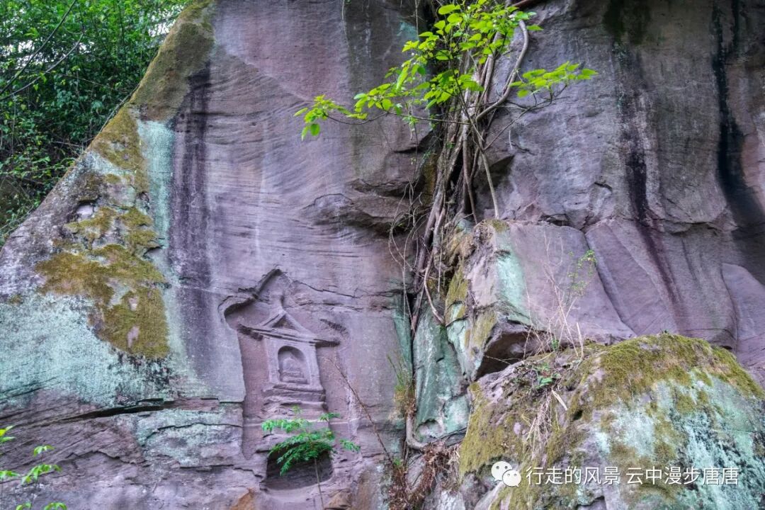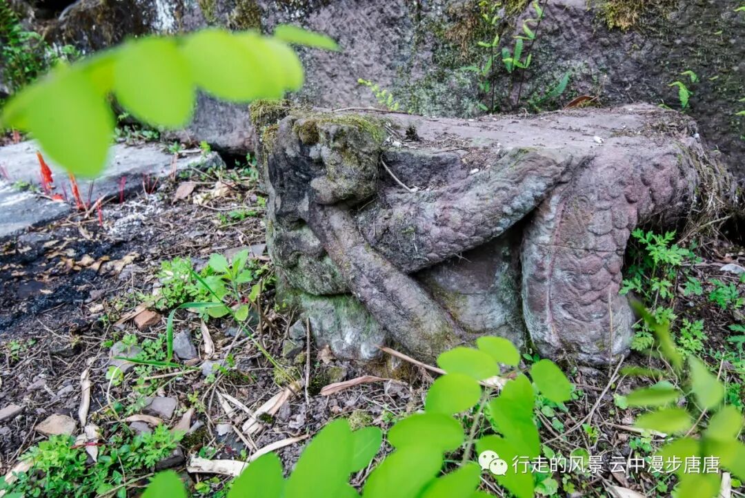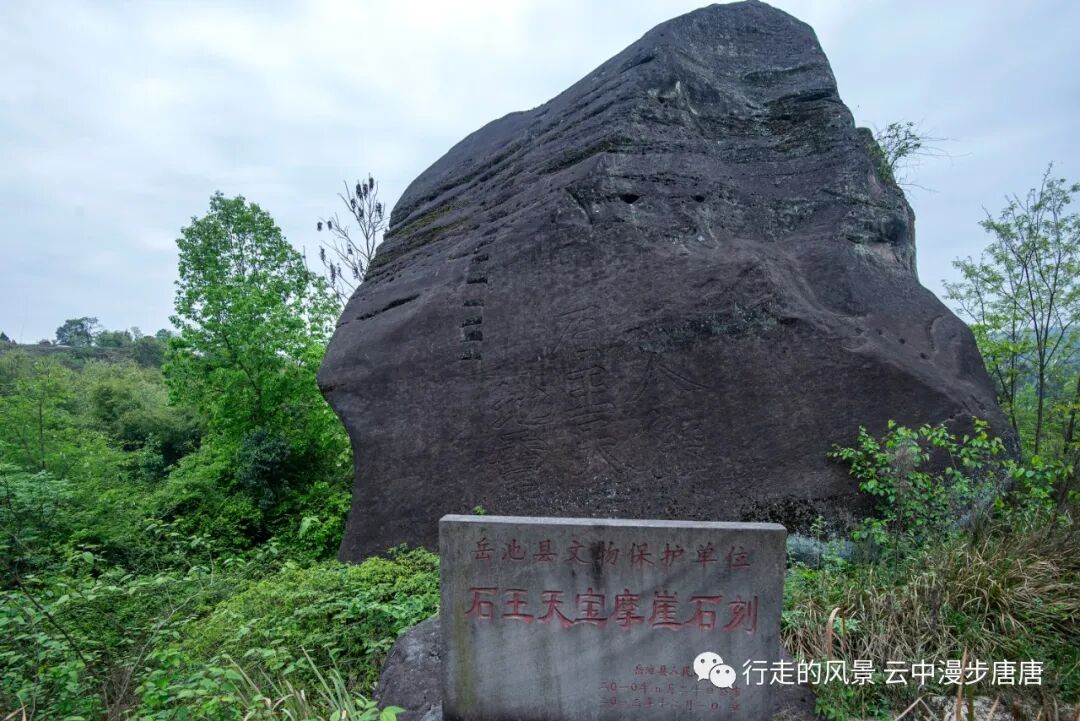 七星照月岩下是观音寺,以前寺里供奉着大量的木头佛像,文革时毁之一炬。观音寺下那大片石头阵里藏着一砣巨石,高约30米,百姓称之为石王天宝。单侧面约有四五十平米的巨石上有竖刻“石王天宝”四个大字,“石王天宝”左右分列刻有“人傑”、“地靈”,石刻左上方凿有十八步脚蹬到顶,据说曾经有一棵高大的桐子树依石而生,可从树上直接登上那十八步脚蹬子。此行恰逢桐子花开的季节,老桐子树已无踪影,旁边的杂草丛中有些许小棵桐子树再生,花朵白中带红,蕊黄缤纷,像一个个小喇叭似的挂在枝间。