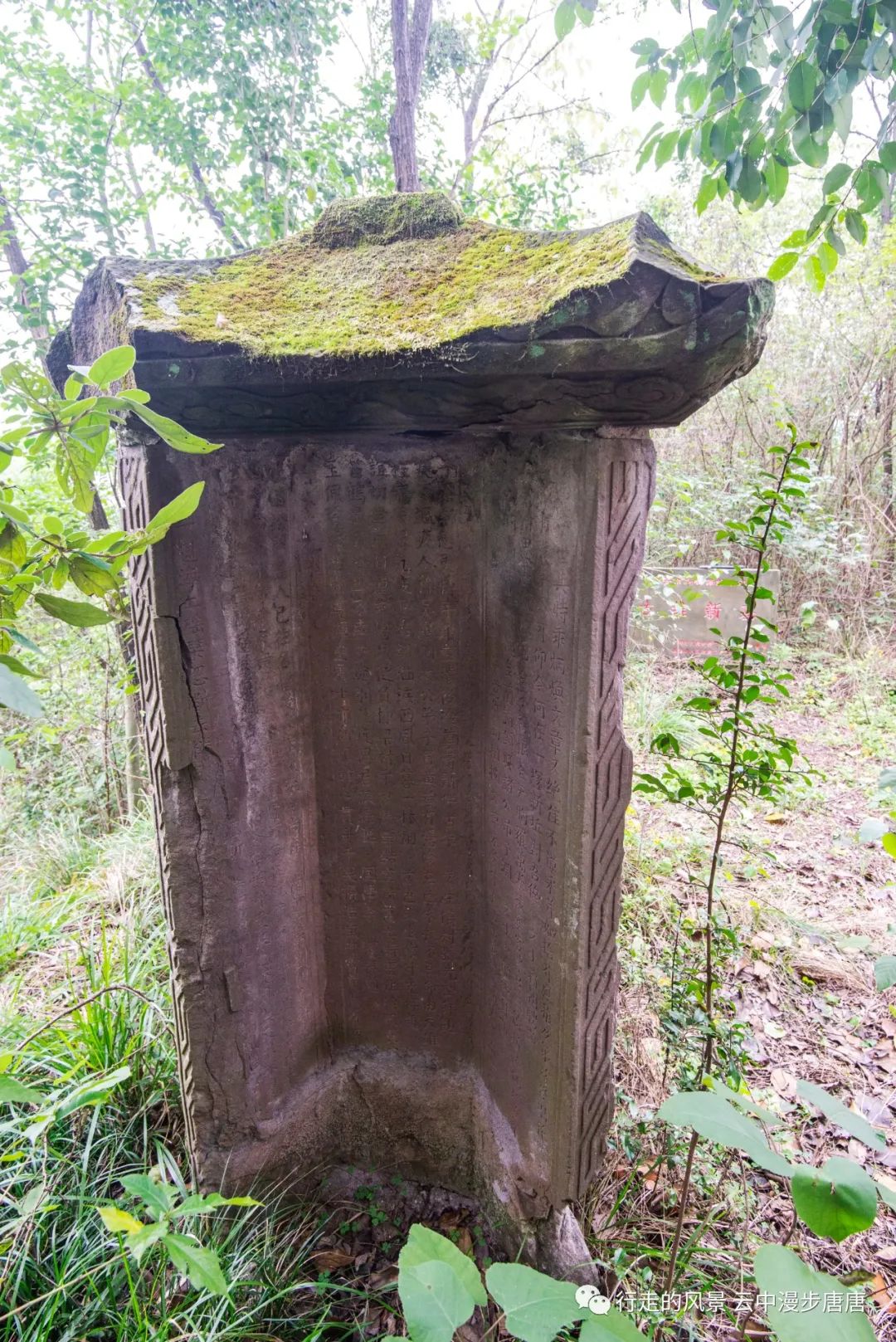 墓前拜台左右两侧各立有一碑亭,碑亭为单檐庑殿式,四角飞檐檐下有浮雕花卉,已满是青苔。两座碑亭均为十二面碑刻,碑刻内容或文或诗,均为文人雅士对墓主的悼念。这些诗文以楷书阴刻,方正严整,十分精美。