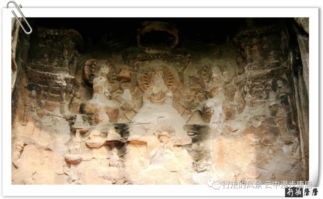 由此诗可看出东岩寺历史悠久,环境清幽。遗憾的是寺已尽无,我们这里说的东岩寺指的是东岩寺摩崖造像。东岩寺摩崖造像隐匿于杂枝密林处,去过两次都有热情的乡民引路,沿江畔崖壁下密林小径穿行方抵达摩崖石刻之下。仰头看去,数百平方米的崖壁上分布有大小龛窟共计15龛,皆为方形,有史记载为唐代始凿。