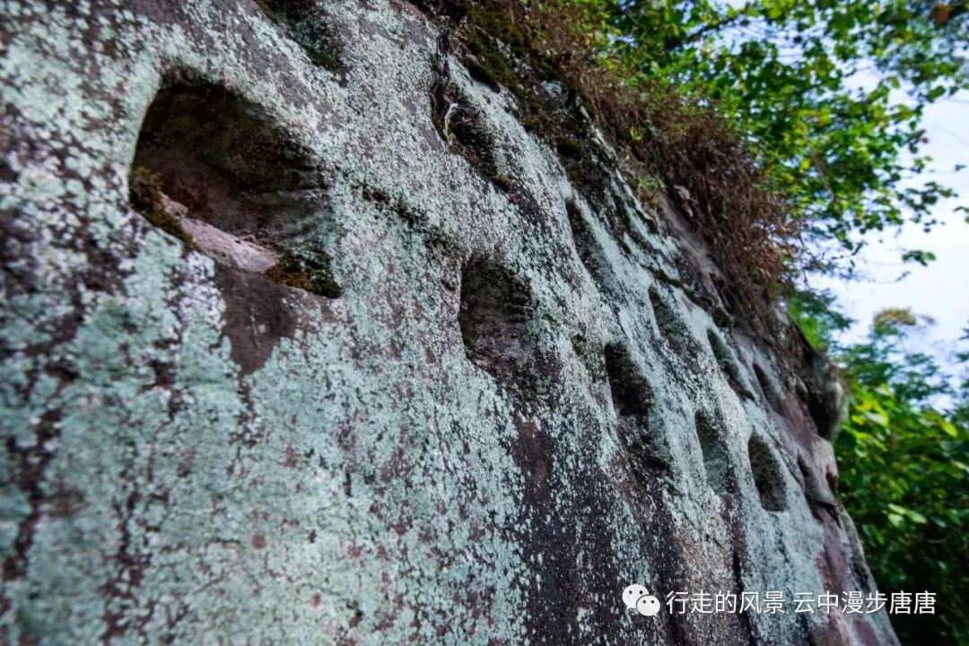 与东岩寺摩崖石刻并立崖壁之上的还有无数密密匝匝数排方形小孔,当地人称“万盏明灯”。相传万盏明灯乃宋元时期东岩百姓所凿,孔内放置油灯,夜幕升起之时点燃油灯,照亮嘉陵江面和对面的汉初县城,以此来迷惑攻打汉初城的蒙军,蒙军见灯火通明以为两岸皆是守军,不敢趁夜偷袭。这便是“万盏明灯照汉初”的由来。其实,我倒是觉得那一个个方形小孔是与东岩寺摩崖石刻为同时期所凿,百姓从江畔朝圣东岩寺祈福,行至摩造像处,点亮一盏又一盏烛火,照亮江上夜行的船只,以保平安。