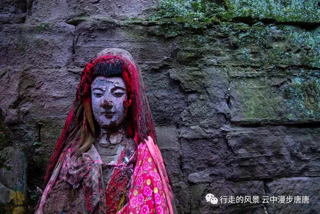 寨子上有碉楼六座,其中两座已坍塌仅剩遗址,曾经有人居住的石屋已人去屋空,生活用具散落屋中与竹林一地,重重腐叶下,石碾越陷越深。已废弃的太平寨神庙残墙颓瓦之中,蛛网缠绕的数尊坐佛斑斑驳驳,低眉慈眼立于垮塌的庙里。供台上的磬儿锈蚀斑斑,试着轻敲一下,回音悠长绕梁,不知声音是否会穿越回前朝旧事。