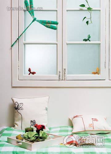窗上的蜻蜓和蝴蝶让我们梦回儿时的烂漫,花朵的靠垫在舒适之余点缀着心情,一点蜡烛,几枝花朵,读一册图画书,做一个童年的梦。http://img1.gtimg.com/cq/pics/21688/21688245.jpg青色家品饰青色靓家" />
