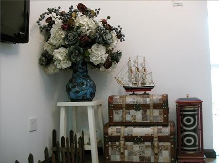客厅的仿古储物箱,地中海风格装饰盘,仿真花。