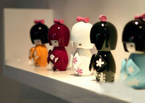隔板上可爱的日式娃娃摆件,灯光下很有情调。