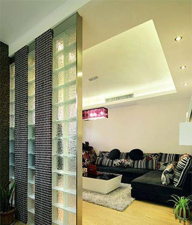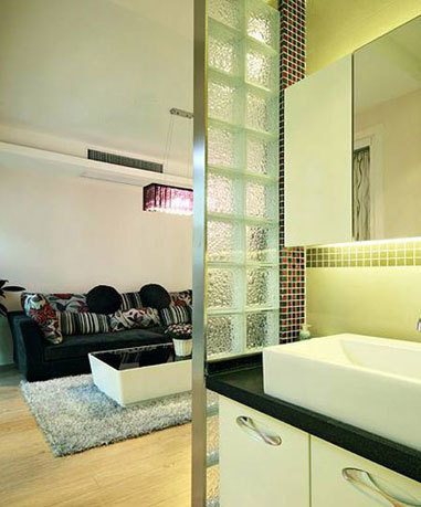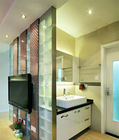 在洗手池这边看客厅,电视背景墙用的是玻璃砖。