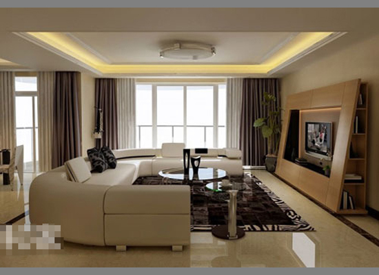 客厅的吊顶是最为别致的设计,展示着一种家居抽象派艺术,不规则形曲线顶一直延至窗体,下方便是客厅电视休息区域,不难发现,电视柜的大理石与地板大理石一致,宛如一致由地板延伸至上方,充满空间设计感。