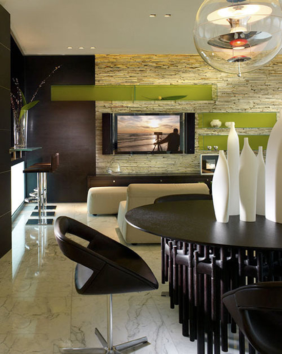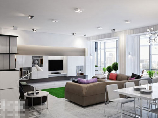 颜色仍旧是可以用来设计出新颖作品的制胜法宝,特别是对于整体较为素淡的室内装饰,运用亮色可以脱颖而出,平行着的三个绿色组合挂壁柜,给素雅的电视背景墙,给予角落冬去春来的苏醒。