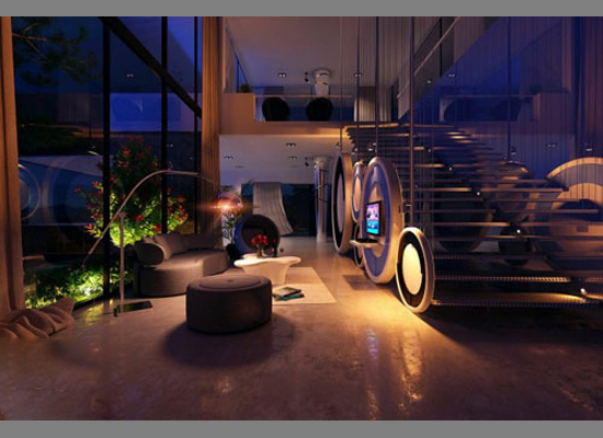 电视背景墙并不一定要设计在主墙体上,通过突发奇想,每个角落都可能成为电视机的立足之处。楼梯间的侧面,用几个大圆盘作了十分美丽的装饰,电视机就被安置在圆盘之中,而沙发区则面对圆盘靠着落地窗摆设,原本不起眼的过道瞬间华丽变身。
