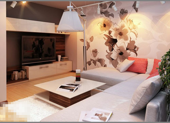 电视背景墙并不一定要在正面呈现,在对于侧墙进行装点,也可以将美丽渲染开,墙纸上素雅的花朵妆点着整个客厅,现代风格中融合了中国的风情,在自然地色调中简单的家饰是最好的搭配。