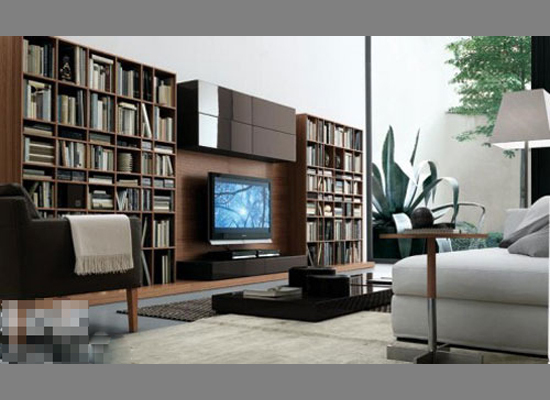 整个电视背景墙由书架与电视柜组成,布局紧凑,书籍满满的收纳其上,但不显凌乱,不失美观,电视机顶部还设有封闭型的挂壁柜,整个背景墙以收纳功能的强大成为亮点。