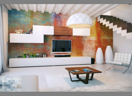 绚丽的色彩,永远是年轻人们的最爱,像这样的裸露砖墙,可以完全摆脱平凡,利用各种颜色对其涂鸦,将一道彩虹幻化之上,配合简单的白色电视柜,整块墙壁成了客厅中最醒目的一角。
