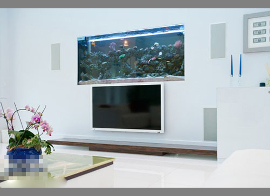 电视背景墙与鱼缸巧妙结合,颇具匠心,体积较大的鱼缸很自然的嵌在了白色墙体内,而内容丰富的鱼种假山,与电视机有着争宠嫌疑,殊不知家人在赏鱼还是在看电视,而这种切换也能保护视力。