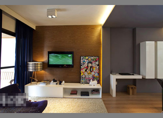 电视背景墙由偏深色木板打造,给予挂壁电视温暖承托,艺术画装饰上并没有采取悬挂方式,而是十分随意的倚靠在白色电视柜上,电视柜上的创意台灯也尤为吸引人,给角落置入更多现代气息。