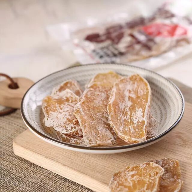 那我告诉你们,这就是红薯原本的味道。上面的白霜是自然析出的糖霜。个人口味不同吧,我觉得这种非常非常好吃。红薯干我从来没有吃到这么软的,这个做得很厉害。