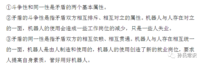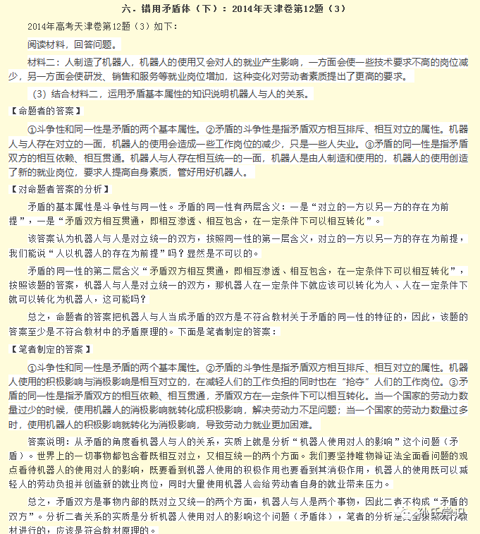 从上面的答案不难看出,命题者是把“机器人”与“人”当成了“矛盾双方”(对立统一的两个方面),按照中学现行教材中矛盾的定义矛盾是“事物内部对立和统一关系”,不知道“机器人与人”这个矛盾是哪个“事物”内部的对立统一关系?
