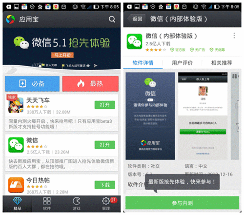 微信5.1在应用宝上发布了,100人的大群终于来了,打飞机也能原地复活了,商务人士、游戏玩家都欢乐了。如果说微信5.0开启了微信的电商时代,那么微信5.1,腾讯将动谁的奶酪,一清二楚。
