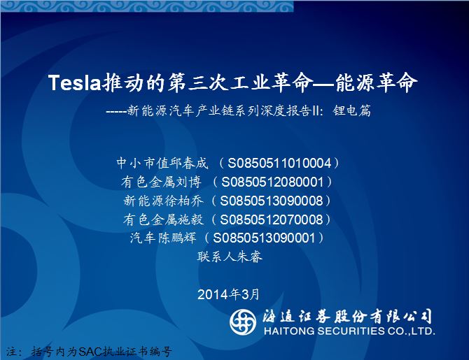 20140319*新能源汽车产业链系列深度报告*Tesla推动的第三次工业革命—能源革命