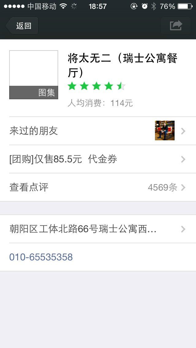 基本上新版本在没有影响到用户使用习惯的条件下,巧妙的将大众点评的数据通过地理位置分享方式植入,然后牛逼闪闪的入口就打开了!当其他用户点击图片下面的地理位置时,就进入了大众点评的商家页面!