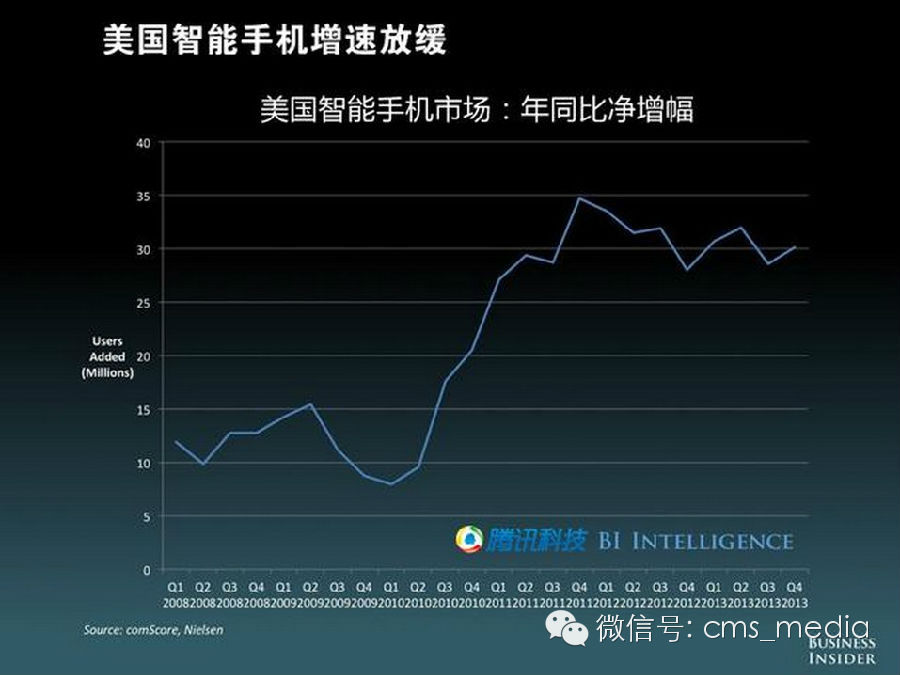 美国智能手机渗透率已经达到65%,这也意味着发达国家的市场接近成熟,增长开始逐渐放缓,净增长量下滑。