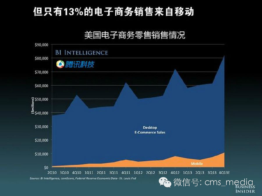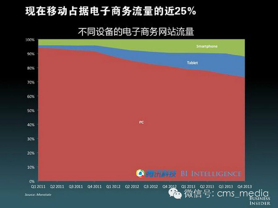 互联网的流量消费中,现在有超过五分之一的流量都来自移动端。PC流量的占比一直在不断下滑。在电子商务的流量中,由移动端产生的流量接近25%。