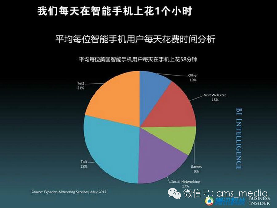 美国用户每天花在智能手机上的时间已经接近1小时,其中28%的时间用于通话、21%时间在发文字信息、17%时间用于社交网络、15%时间在浏览网页、9%时间用于玩游戏。
