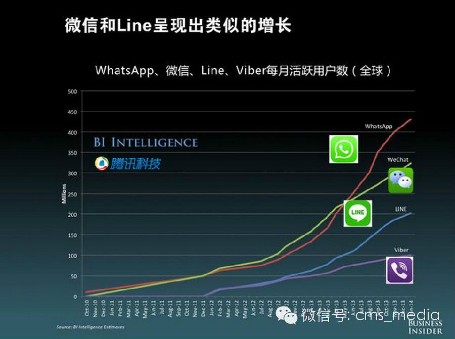 移动互联网为新的通讯应用带来了增长动力。包括WhatsApp、Instagram和Snapchat应用的用户基数都在增长。目前,WhatsApp的活跃用户超过4.5亿,日新增用户超过了100万。同理,微信、Line、Viber的月活跃用户也都在增长。